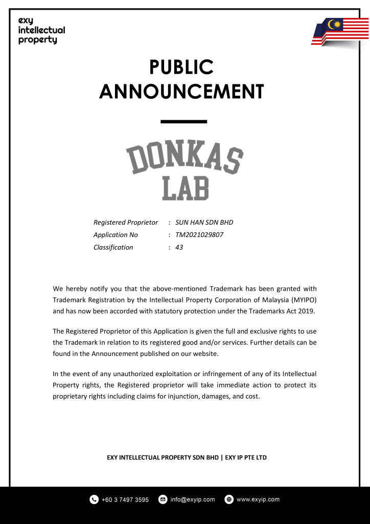 Agent : EXY IP PLT, Lot 2928 & 2929, Jalan PJS 3/1, Bandar Petaling Jaya Selatan Petaling Jaya 46000 Selangor (MY)